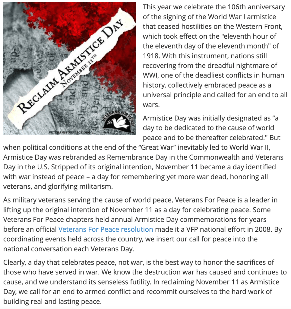 - COMING SOON! Reclaim Armistice Day (from Veterans Day) Observance (November 11)